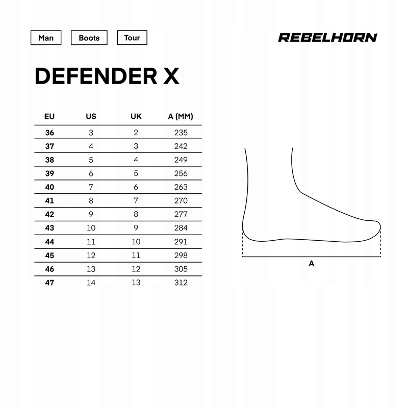 Buty motocyklowe Rebelhorn Defender X to wysokiej jakości skórzane buty turystyczne, stworzone z myślą o długich trasach, zapewniające maksymalny komfort, ochronę i dopasowanie. Wyposażone zostały w dwa wygodne i szybkie w obsłudze zapięcia ATOP. Buty Defender X zostały wykonane z naturalnej skóry bydlęcej i materiału Cordura® o wysokiej trwałości oraz posiadają wyjątkowo wytrzymałą podeszwę Vibram® odporną na ścieranie.