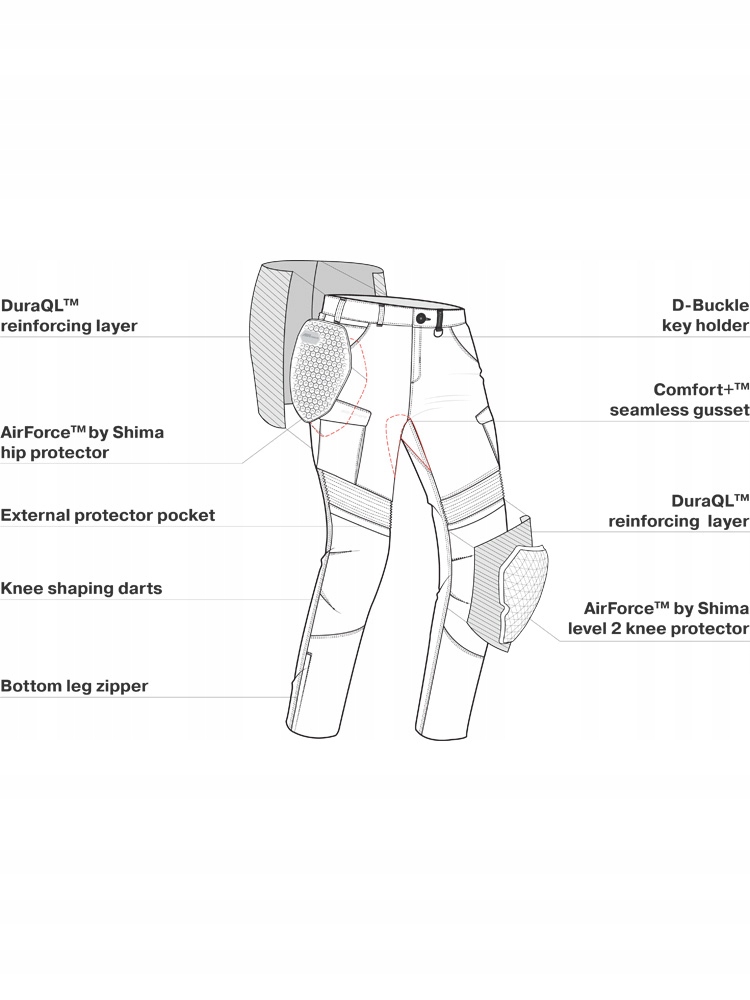 Wyposażony jest w przewiewne certyfikowane protektory bioder (lvl 1) i kolan (lvl 2) AirForce™ by SHIMA z 2-stopniową regulacją wysokości. Posiada także warstwę wewnętrzną z mieszanki włókien aramidowych i chłodzących – DuraQL™, która zapewni Ci ochronę najbardziej narażonych na urazy miejsc oraz odpowiedni komfort termiczny. Ergonomiczna konstrukcja 3D, panele harmonijkowe z tyłu i nad kolanem oraz bezszwowy klin Comfort+™ znacznie zwiększają swobodę ruchów. Aby jeszcze bardziej zadbać o Twoją wygodę, spodnie GIRO 2.0 zostały zaprojektowane z możliwością regulacji nogawki oraz zamkami na dole ułatwiającymi ich zakładanie.