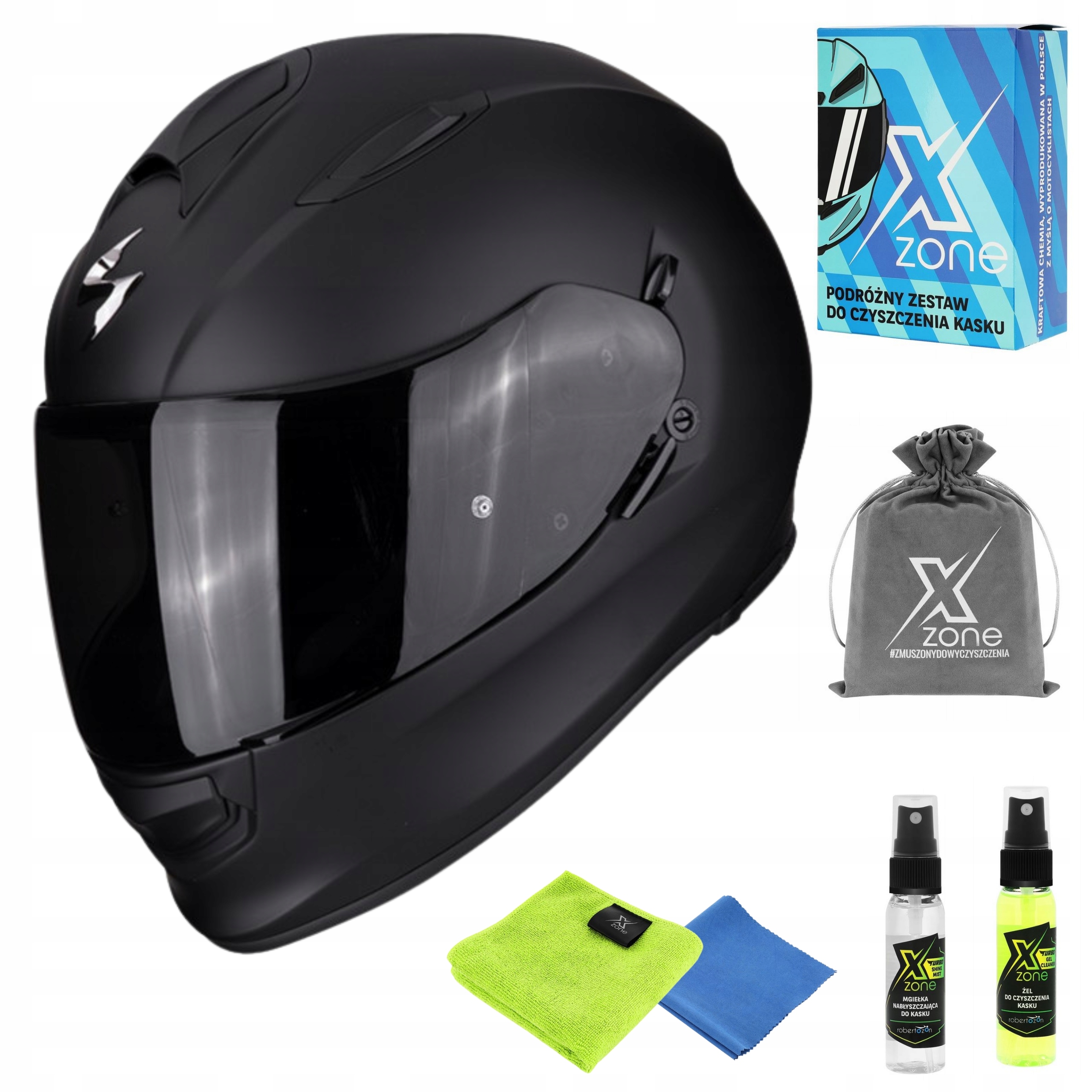 Produkty Xzone do kasku to nowa zaawansowana formuła, dzięki której Twój kask odzyska czystość oraz blask. Poręczny zestaw został stworzony dla każdego motocyklisty, zmieści się do kieszeni oraz do schowka w motocyklu. Składa się z dokładnie opracowanych produktów w kompaktowych opakowaniach, podróżnego woreczka oraz ścierek z mikrofibry o różnej gramaturze i wielkości.