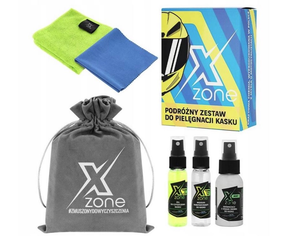 Zestaw do pielęgnacji kasku Xzone – to nowa zaawansowana formuła, dzięki której Twój kask odzyska czystość oraz blask. Zestaw został stworzony dla każdego motocyklisty. Dlatego składa się z dokładnie opracowanych produktów oraz ścierek z mikrofibry o różnej gramaturze i wielkości. Zestaw jest bardzo wydajny, ponieważ stanowi uzupełnienie dla zestawu podróżnego w podręcznym woreczku.