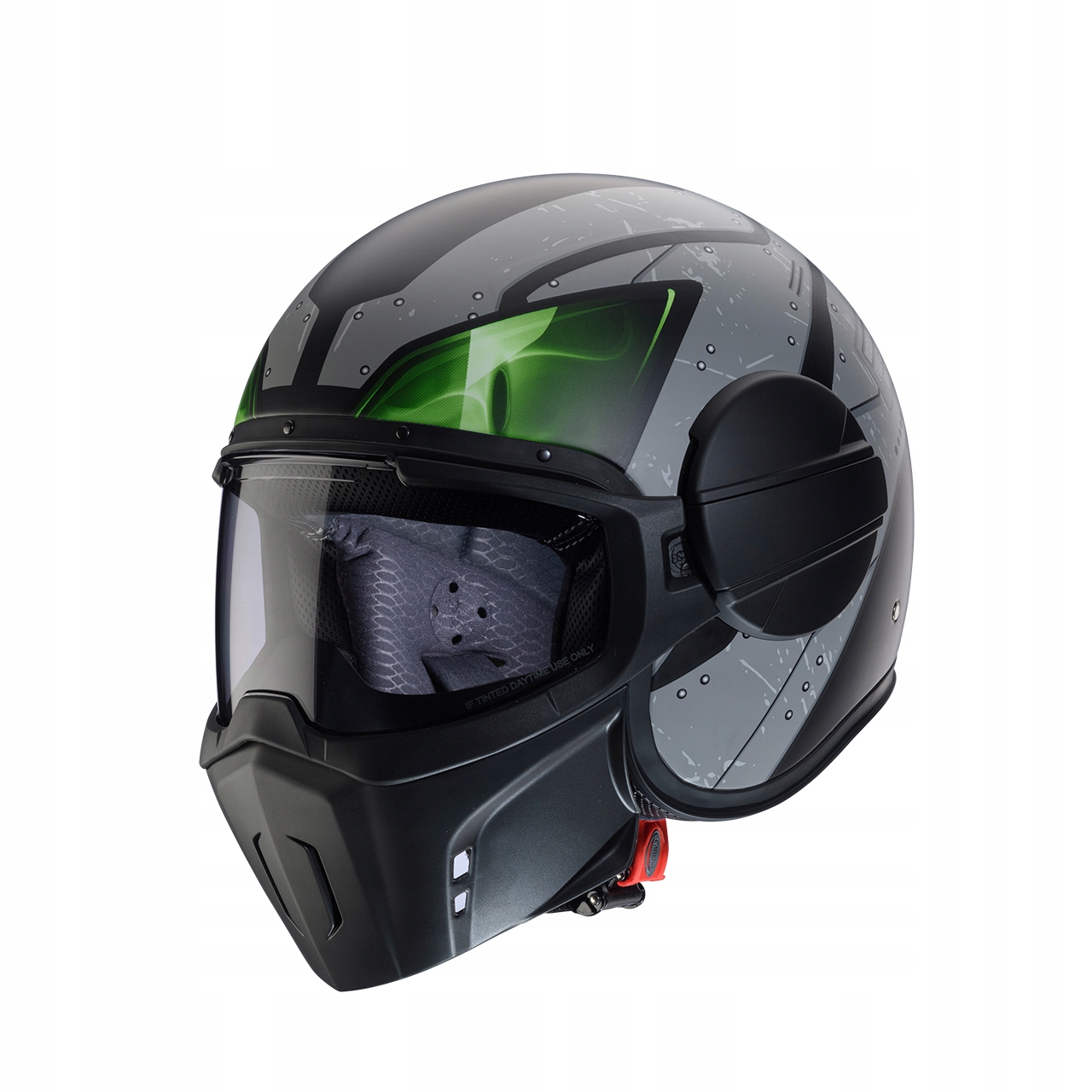 Ten modułowy kask jest wyposażony nie tylko w wizjer w kształcie gogli, który przylega do twarzy dzięki profilowi piankowemu wzdłuż wewnętrznej dolnej części wizjera, ale także w łatwą w użyciu maskę chroniącą twarz przed zimnem w miesiącach zimowych i przed połknięciem zbyt wielu komarów w okresie letnim. Dzięki sprężynowemu systemowi odchylania, otwieranie i zamykanie przyłbicy jedną ręką jest bardzo proste i intuicyjne. Ta cecha odróżnia Ghost X od innych kasków z otwartą twarzą dostępnych na rynku, wyposażonych w proste gogle, maskę i standardowe elastyczne paski.