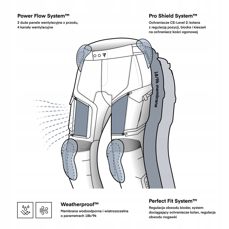 Materiał typu heat-resistance od wewnętrznej strony nogawki, chroniący przed przypaleniem spodni o elementy układu wydechowego