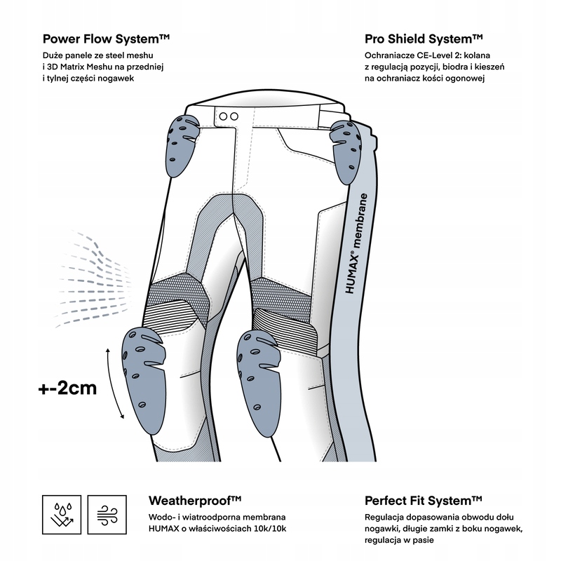 Wytrzymałe materiały wysokiej jakości gwarantują bezpieczeństwo, a przewiewny i trwały 3D Matrix Mesh zapewnia świetną wentylację, bez straty na wytrzymałości materiału. Dzięki membranie Humax® o parametrach 10k/10k, spodnie JAX zapewniają optymalną ochronę przed warunkami atmosferycznymi.